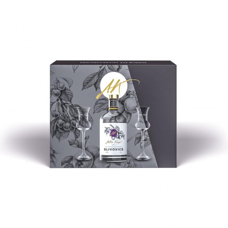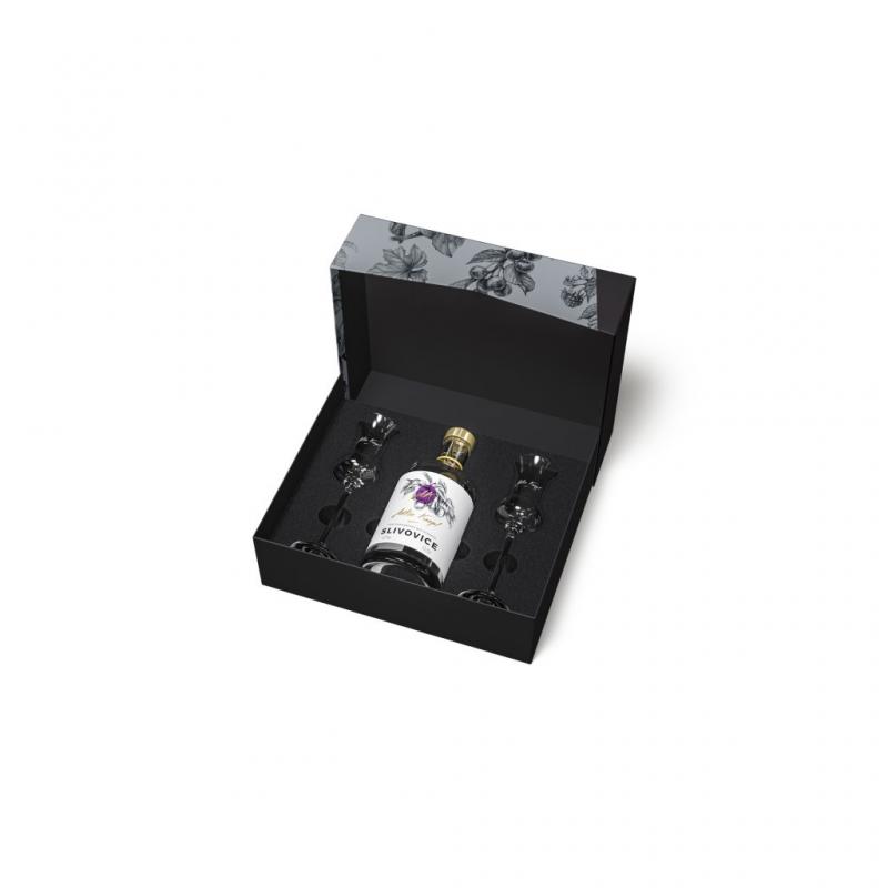 Luxusní dárková balení tzv. klapboxy z tvrdého papíru tloušťky 1,4 mm s ofsetovým barevným tiskem, matnou laminací a s pěnovou výstelkou naplněné lahví našeho kvalitního destilátu a degustačními skleničkami z českého skla.