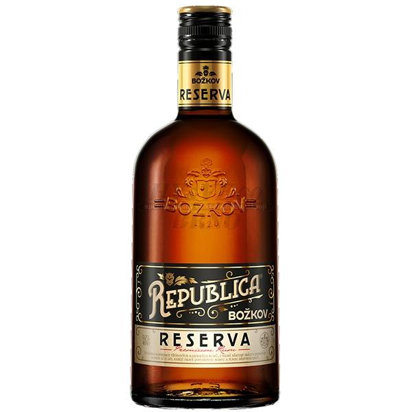 Božkov Republica Reserva 0,7l 40% - je vyváženou kombinací třtinových karibských rumů, z nichž některé zrály v dubových sudech až 12 let. Díky dlouhému zrání je barva tmavě jantarová. Chuť cukrové třtiny, pomerančů a fíků s lehkým dubovým závěrem. Vůně exotického ovoce, kávy, karamelu a sušených švestek.