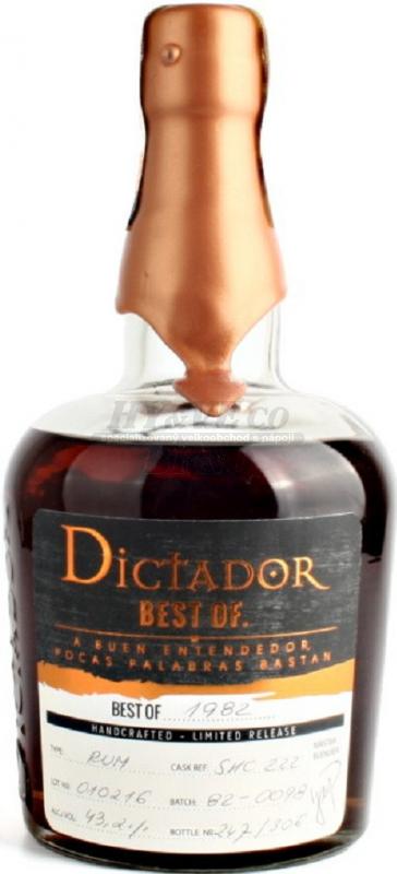 Dictador 1982 z limitované série Best Of. Celkovou exkluzivitu podtrhuje ručně psaná etiketa, obsahující jak údaje o rumu tak podpis master blendera. |