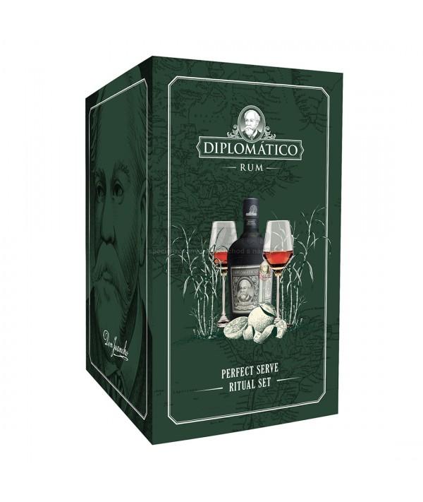 Diplomatico Reserva Exclusiva Rum 12yo 0,7l 40% Dárkové balení + 2 skleničky - je venezuelský tmavě zlatý rum vynikající kvality. Je destilovaný z melasy v měděných kotlíkových zařízeních a zraje v průměru dvanáct let v sudech po bourbonu. Je perfektně vyvážený, lahodný a neskutečně jemný nápoj. Sladký, s ovocnou chutí, což je charakteristické pro všechny rumy Diplomático, avšak obsahuje ještě vyšší koncentraci a intenzivnější chuť. Jedná se o výjimečný rum určený k pomalému upíjení, který se stal lahůdkou pro všechny milovníky rumů.