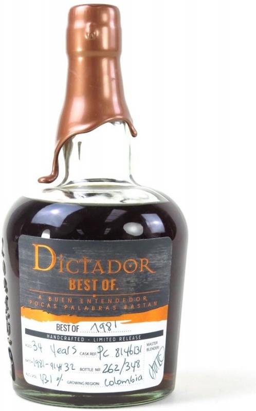 Dictador 1981 z limitované série Best Of. Celkovou exkluzivitu podtrhuje ručně psaná etiketa, obsahující jak údaje o rumu tak podpis master blendera. |
