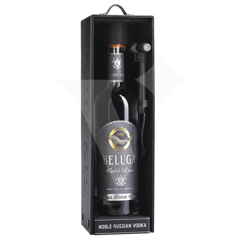 Beluga Gold Line je pětkrát filtrovaná, s mimořádně jemnou chutí. Korek je zalitý voskem a každá láhev má u sebe kladívko a štětec pro rituální servis. |